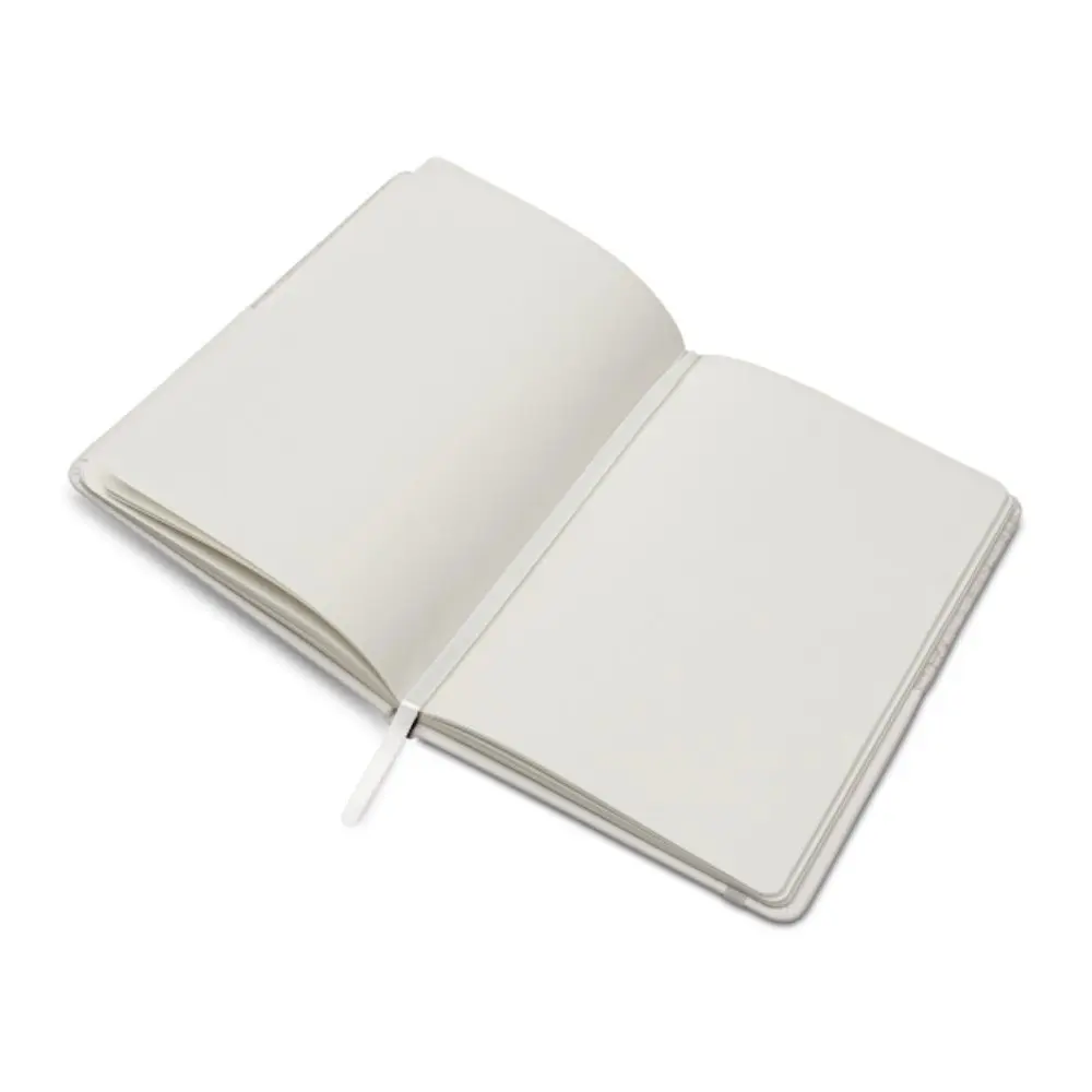 Cuaderno tapa dura forrado mitad en lino y mitad en eco cuero soft mate.