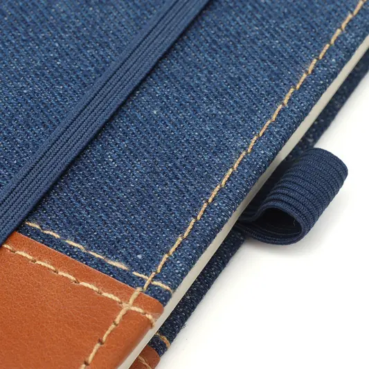 Cuaderno tapa dura forrado en tela Denim y cuero ecológico.